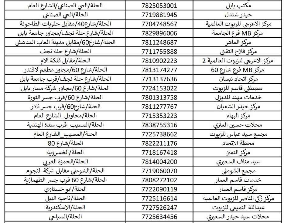 | الحلة/شارع 60/مجاور شركة مسار بابل | 7724153022 | مصطفى قاسم للزيوت |