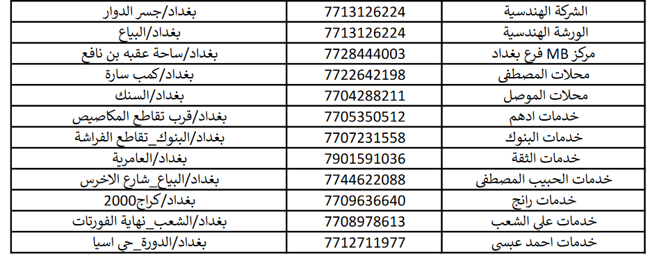 | بغداد/ساحة عقبه بن نافع | 7728444003 | مركز MB فرع بغداد |